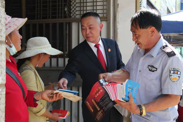 活动现场,工作人员充分发挥宣传职能,不仅在活动现场放置相关法律法规的宣传展牌,张贴法制宣传条幅标语、发放宣传资料、设置法律咨询台,发放宪法、民法典等相关法律知识读本以及“以案说法”宣传单;还积极将法律知识读本送到墨红镇街道上的商店里、公交车里、过往行人的手里,在普法宣传的现场为过往的群众答疑解惑。