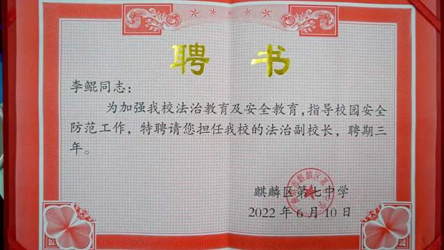6月10日上午,曲靖市麒麟区第七中学法治副校长聘任仪式在区七中阶梯教室举行,曲靖市麒麟区人民法院院长李鲲受聘担任区七中法治副校长。