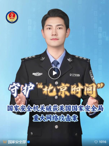 近期,国家安全机关破获一起美国重大网络攻击案,掌握美国国家安全局网络攻击入侵中国国家授时中心的铁证,粉碎美方网攻窃密和渗透破坏的图谋,全力守护“北京时间”安全。